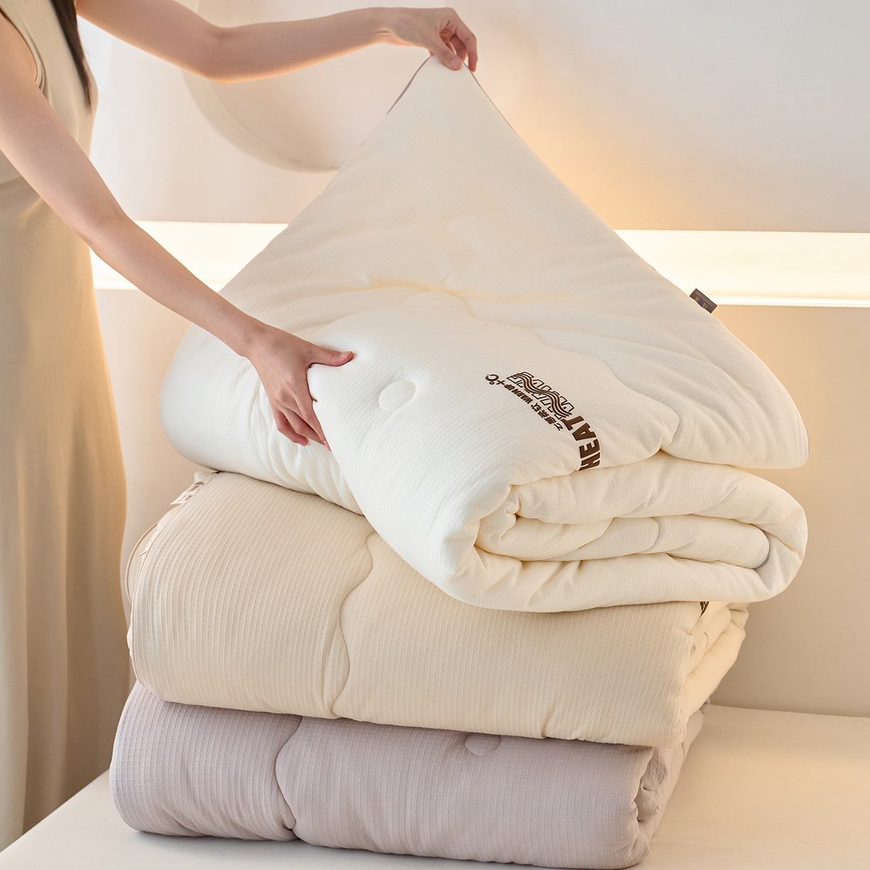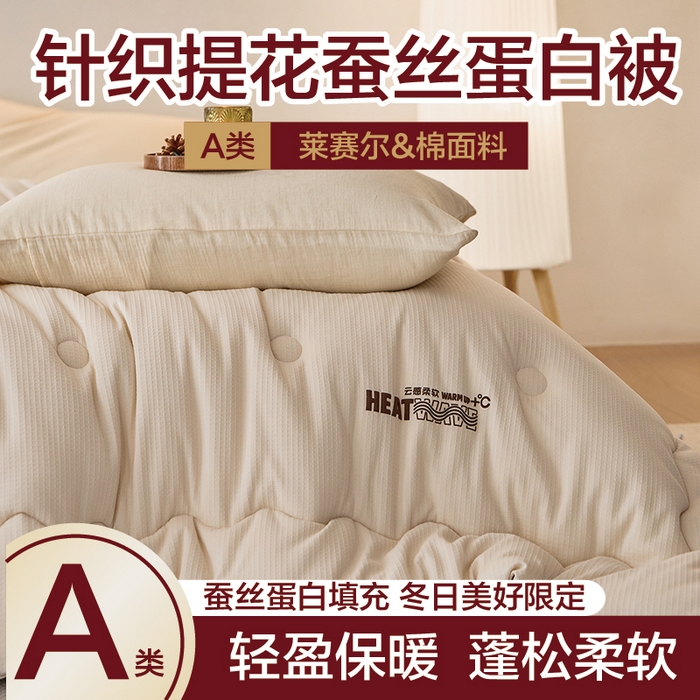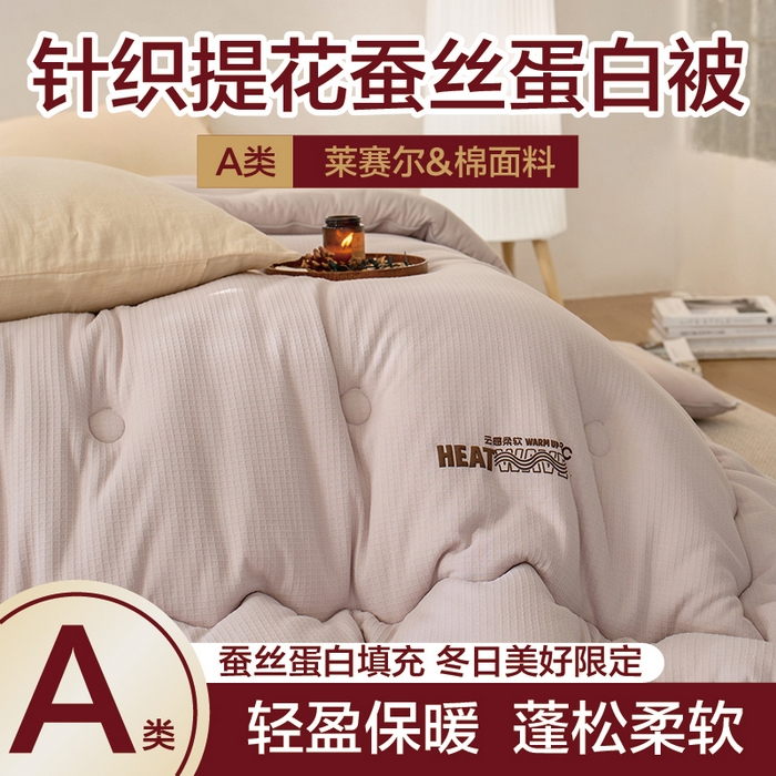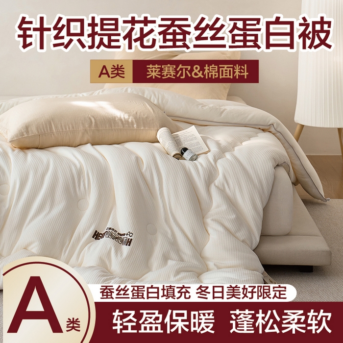 当前位置: 莱宁被业> 产品中心 > 2025高端A类天丝棉针织提花蚕丝蛋白冬被春秋被子柔软加厚家用被芯
